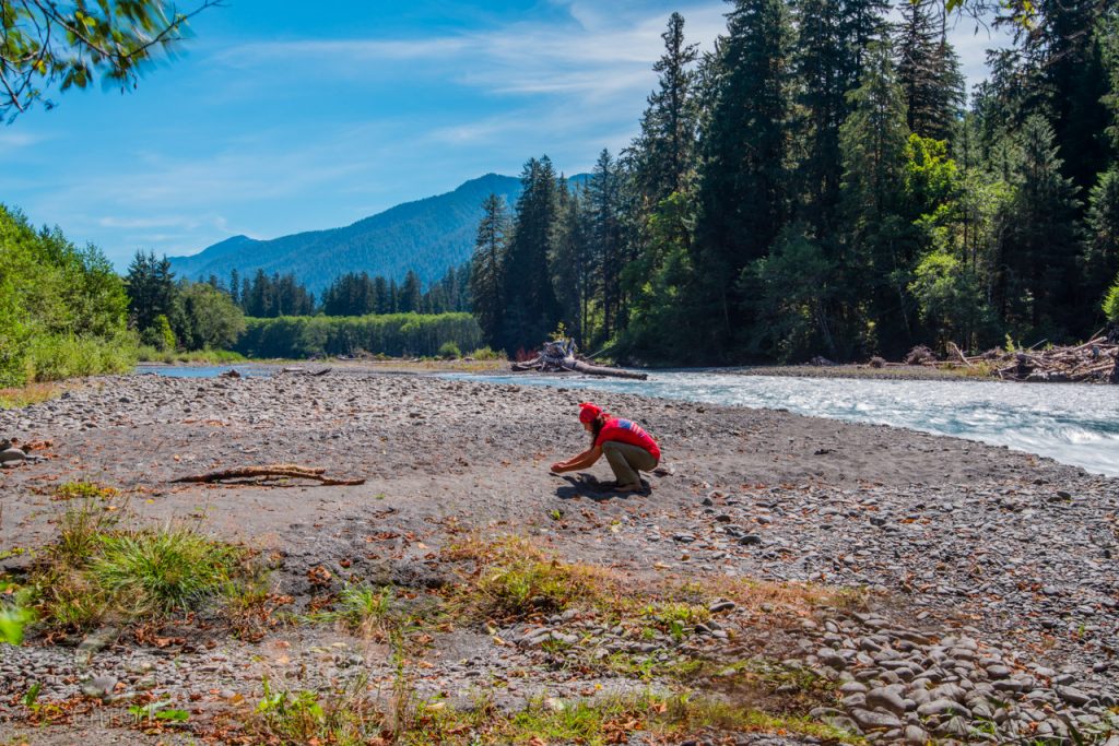 Scott resumed his position to photograph the Hoh’s moving crystal blue, glacier water while I took myself to the gray, pebbled substrate. Just when I was about to give up on that area, I spotted something green & shiny. Once again, I gleefully called out to the man! He was already sneaking a shot of me playing with the Crtrs.